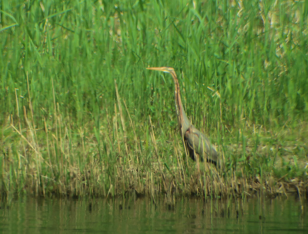 Limikolen wie Temminckstrandläufer, Bruchwasserläufer, Grünschenkel und Kampfläufer im Prachtkleid, um nur einige zu nennen, finden wir dann an unserem zweiten Beobachtungspunkt am Donau-Altwasser (Bild) bei Aholfing. Vom Damm aus kann man gut in die überflutenden Wiesen gucken. Die Entfernungen sind sehr groß, daher habe ich von den relativ kleinen Vögeln leider keine brauchbaren Bilder. Anders verhält es sich natürlich beim stattlichen Weißstorch (Bild). Zu unser aller Freude zeigt sich auch ein Purpurreiher (Bild). Er schreitet langsam am Ufer entlang, kommt an einem Graureiher vorbei und fliegt dann in unsere Richtung, verschwindet allerdings im hohen Schilf.