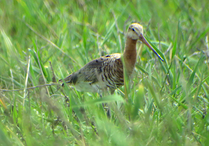 Zur Mittagszeit haben sich die grauen Wolken verzogen und ich beschließe, zu den Wörthen Lacken (Plan) zu fahren. Ein in den meisten Ortschaften des Gebietes heimischer Brutvogel ist der Weißstorch. Auch in Apetlon sind zwei Weißstörche (Bild) auf ihrem Horst anzutreffen. An den Wörthen Lacken angelangt fallen mir die hübschen Säbelschnäbler (Bild) auf, die auch hier schon – wie am Unterstinkersee – beim Brüten sind. Eigentlich bin ich ja wegen der Weißflügel-Seeschwalben gekommen, die in dieser Gegend gesichtet wurden. Doch erst am Ende der Tour finde ich sie, allerdings in großer Distanz. Dafür kann ich Uferschnepfen (mehrere davon auf den Bildern) lange und aus nächster Nähe studieren. Nur wenige Meter vom Weg entfernt sehe ich einen Vogel, wie er bedächtig und mit ruhigen Schritten zwischen den hohen Gräsern im Boden stochert. Um ihn nicht zu stören, schleiche ich ganz langsam auf den Aussichtsturm. Bald kommen mit lauten, schnellen Rufen (Tonbeispiel > xeno-canto.org) weitere Uferschnepfen angeflogen. Es gibt aufgeregte Begrüßungsszenen. Oder sind es vielleicht Revierkämpfe? Als sie sich dann wieder beruhigt haben, suchen sie gemeinsam nach Insekten und Würmern oder genehmigen sich ein Nickerchen. Mit zwischen 55 und 110 Paaren ist die Uferschnepfe ein häufiger Brutvogel im Nationalpark. Nach der Brutzeit lassen sich große Ansammlungen mausernder Uferschnepfen beobachten (Quelle und mehr Infos > Webseite Nationalpark Neusiedler See). Die Uferschnepfe brütet in Feuchtwiesen und Niedermooren. Der große Watvogel hat lange schwarze Beine und einen langen geraden Schnabel. Letzerer ist eines der wichtigsten Unterscheidungsmerkmale zur Pfuhlschnepfe. Beide Vogelarten ähneln sich sehr, die Pfuhlschnepfe besitzt aber einen etwas kürzeren, nach oben aufgeworfenen Schnabel. Im Flug sind bei der Uferschnepfe die breiten weißen Flügelstreifen und der weiße Bürzel gut zu sehen. Im Gegensatz zur Pfuhlschnepfe weist die Uferschnepfe eine schwarze Schwanzbinde auf, die Zehen stehen deutlich über.