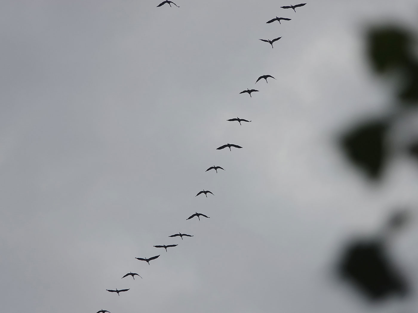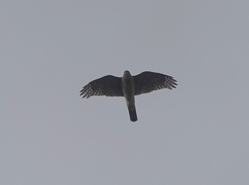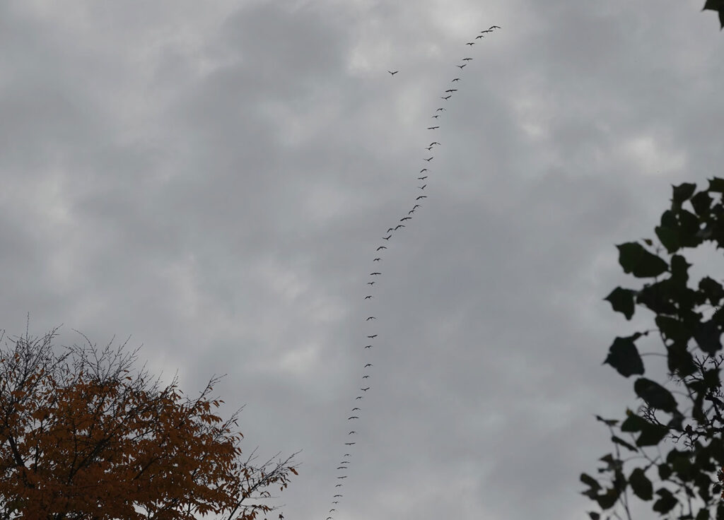Während ich meinen Spaziergang fortsetze, entdecke ich noch eine Schwanzmeise (Bild). Plötzlich fliegt ein Sperber (Bild) über mich hinweg. Gegen 16.15 Uhr verlasse ich den Friedhof und mache mich mit dem Fahrrad auf den Heimweg. Als ich am Café am Ostfriedhof vorbeikomme, bemerke ich, dass einige Leute den Kopf nach oben strecken. Was ist denn da los? Ich halte an und suche den Himmel ab. Und da sehe und höre ich sie schon. Ein Trupp Kraniche (Bilder) – ca. 100 Vögel – fliegt in Formation über den Ostfriedhof in westliche Richtung. Wow, das ist noch ein schöner Abschluss meiner heutigen Tour.
