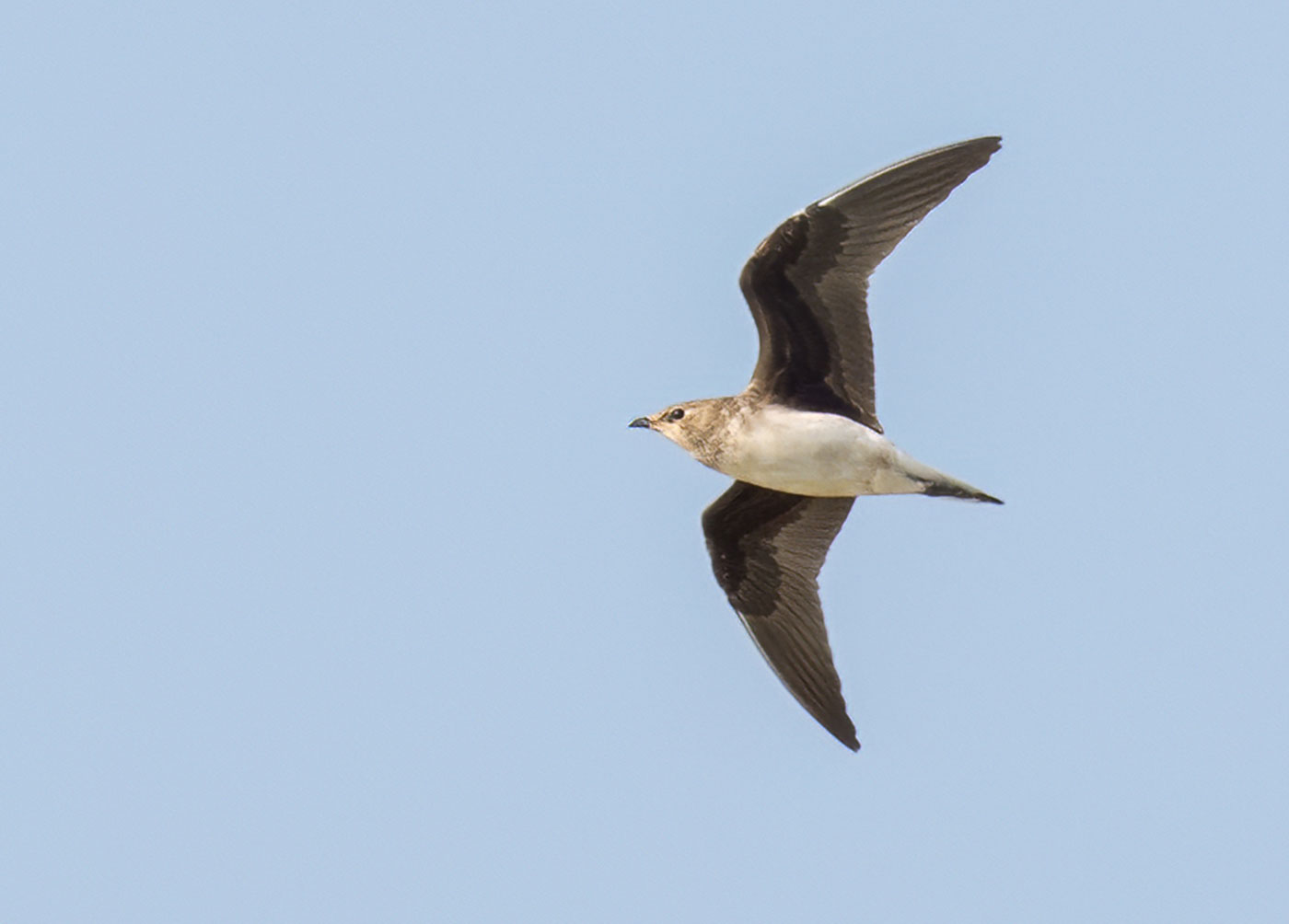 Heute unternehme ich den 2. Versuch, die Schwarzflügel-Brachschwalbe zu finden. Sie wurde am Darscho gemeldet. Die Bilder, die auf Ornitho zu sehen sind, zeigen den Vogel entweder fliegend in der Luft oder in einer Wiese. Ihn in der Luft zu erkennen, würde ich mir nicht zutrauen, also konzentriere ich mich auf die überflutete Wiese in der Nähe des Sees. Die Schwarzflügel-Brachschwalbe kann ich nicht entdecken, wohl aber eine Pfuhlschnepfe (Bild). Vor Ort bin ich nicht allein, mehrere Birder sind anwesend. Ich erfahre, dass die Schwarzflügel-Brachschwalbe gemeinsam mit Kiebitzen unterwegs ist. Und sie soll nördlich vom Darscho auf einem Feld gesichtet worden sein. Es ist wie in einem Krimi, so spannend … Ich radle also zu dem besagten Feld (Bild). Dieses nach Kiebitzen absuchen – das kann ich. Noch zwei andere Birder sind anwesend, den Franz aus Rosenheim habe ich in der Pension schon kennengelernt. So suchen wir gemeinsam das Feld ab und finden inmitten der rastenden Kiebitze schließlich die Schwarzflügel-Brachschwalbe (Bilder). Es handelt sich um ein Jungtier, weist also noch nicht die eindeutigen Bestimmungsmerkmale wie das Rot an der Schnabelbasis und den schwarzumrandeten hellgelben Kehlfleck auf. Eigentlich kann man Schwarzflügel-Brachschwalben nur mit Rotflügel-Brachschwalben verwechseln, aber wie letzterer Name schon nahelegt, ist das Unterscheidungsmerkmal u.a. die Farbe der unteren Flügel. Anhand der tollen Flugfotos von Franz Fischer ist die Bestimmung eindeutig. »Die Schwarzflügel-Brachschwalbe brütet in Südosteuropa in Steppen und Feuchtwiesen, überwintert in Südafrika«, lese ich im Kosmos-Vogelführer (Svensson, Mullarney, Zetterström). Eine Rotflügel-Brachschwalbe im Prachtkleid habe ich im Mai 2021 im Donaumoos schon einmal gesehen.