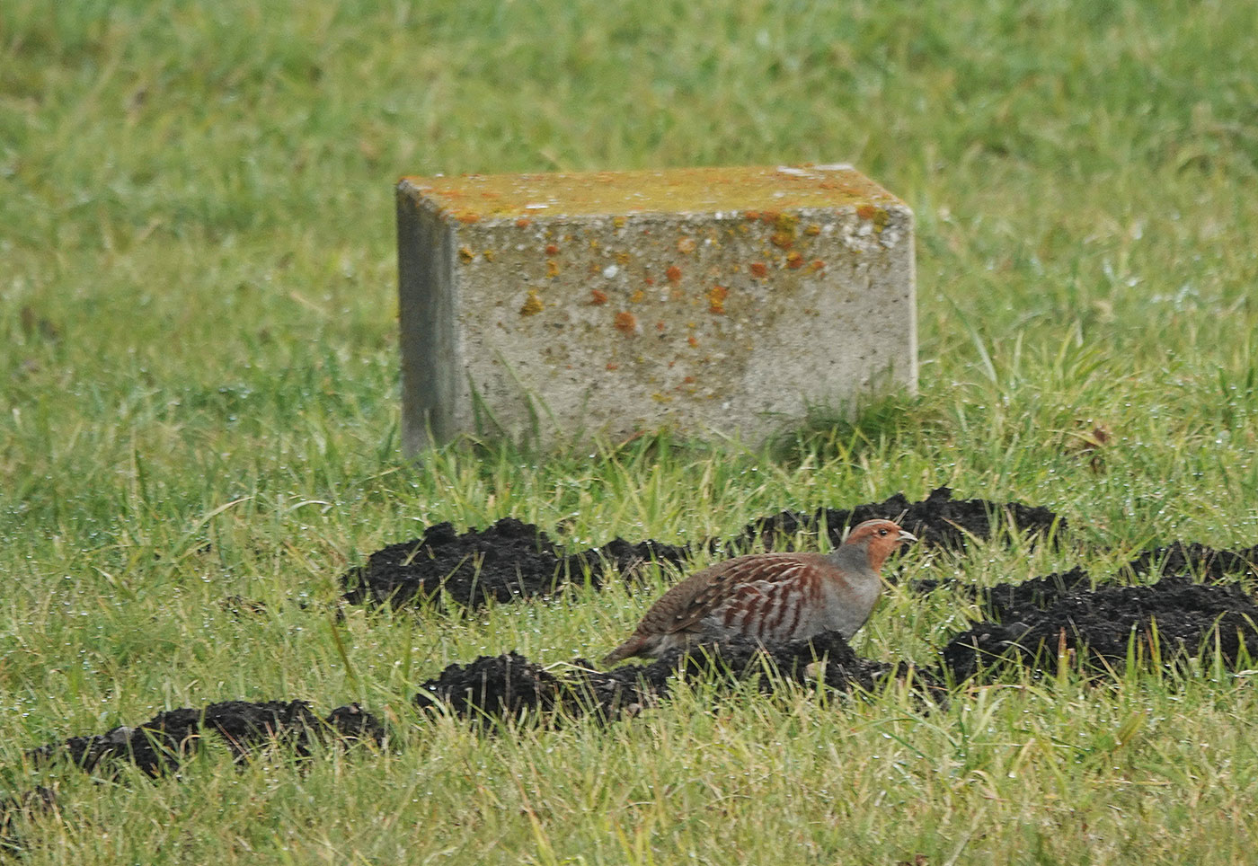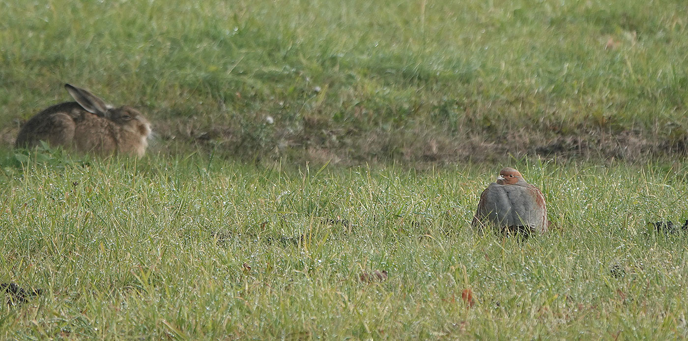 Der eigentliche Grund für meine Tour sind die Rebhühner, die hier regelmäßig gesichtet werden. Heute kann ich leider keine größere Anzahl finden, aber in dem abgezäunten Bereich bei den historischen Flugzeugen entdecke ich wenigstens ein Rebhuhn (Bilder). Unweit eines ruhenden Feldhasen hat es sich ebenso zu einer Pause niedergelassen. Später läuft es gemächlich pickend durch das feuchte Gras. Anhand des größeren dunkelbraunen Bauchflecks gehe ich davon aus, dass sich um ein Männchen handelt. Die Geschlechter sind nur durch wenige Merkmale zu unterscheiden. Männchen sind etwas bunter und deutlicher gemustert. Zudem ist ihr dunkelbrauner Bauchfleck größer als der der Weibchen. »Rebhühner bewohnen Steppen- und Heidelandschaften in weiten Teilen Europas und Asiens. Sie ernähren sich überwiegend von Sämereien, Wildkräutern und Getreidekörnern« lese ich in Wikipedia. In diesem Herbst wurde das Rebhuhn in Deutschland zum Vogel des Jahres 2026 gewählt. Der früher weit verbreitete Agrarvogel ist leider mittlerweile stark gefährdet.