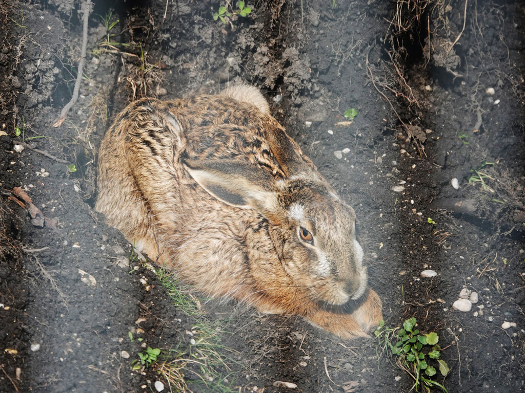 Aber nicht nur das Rebhuhn erfreut heute mein Herz, sondern auch die Kraniche (Bild), die plötzlich am Himmel auftauchen und über den nördlichen Teil des Flughafens hinwegziehen. Auf dem Rückweg zur S-Bahn suche ich auf den Grünflächen noch intensiv nach den Hühnervögeln, finde aber leider keine mehr. Dafür sehe ich eine Ringeltaube (Bild), eine Blaumeise (Bild) und einen Feldhasen (Bild), der sich in einer Kuhle auf einem größeren Erdhaufen niedergelassen hat.
