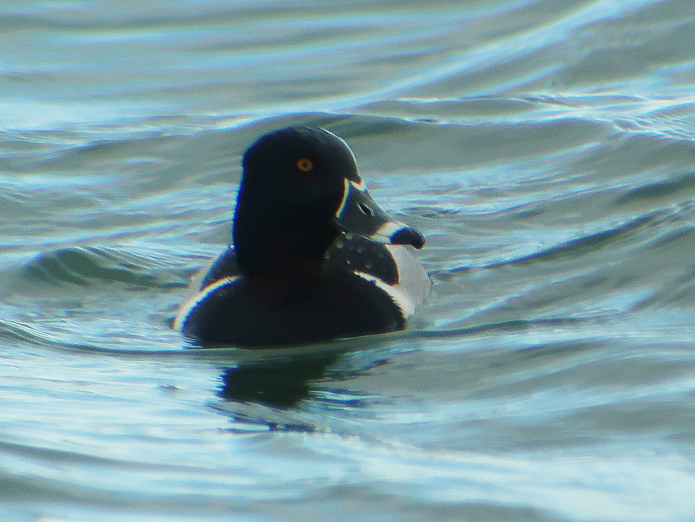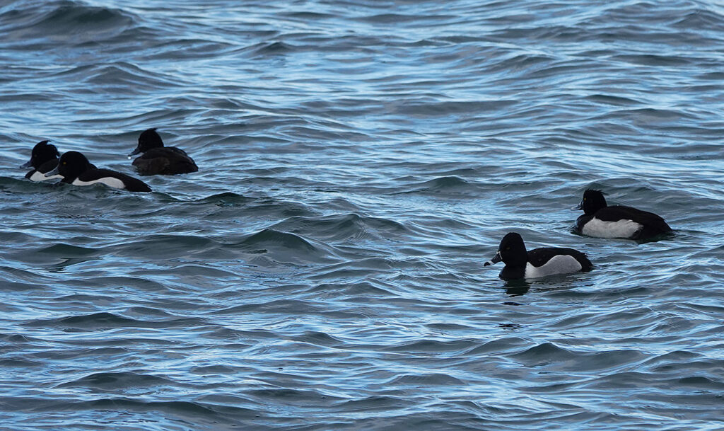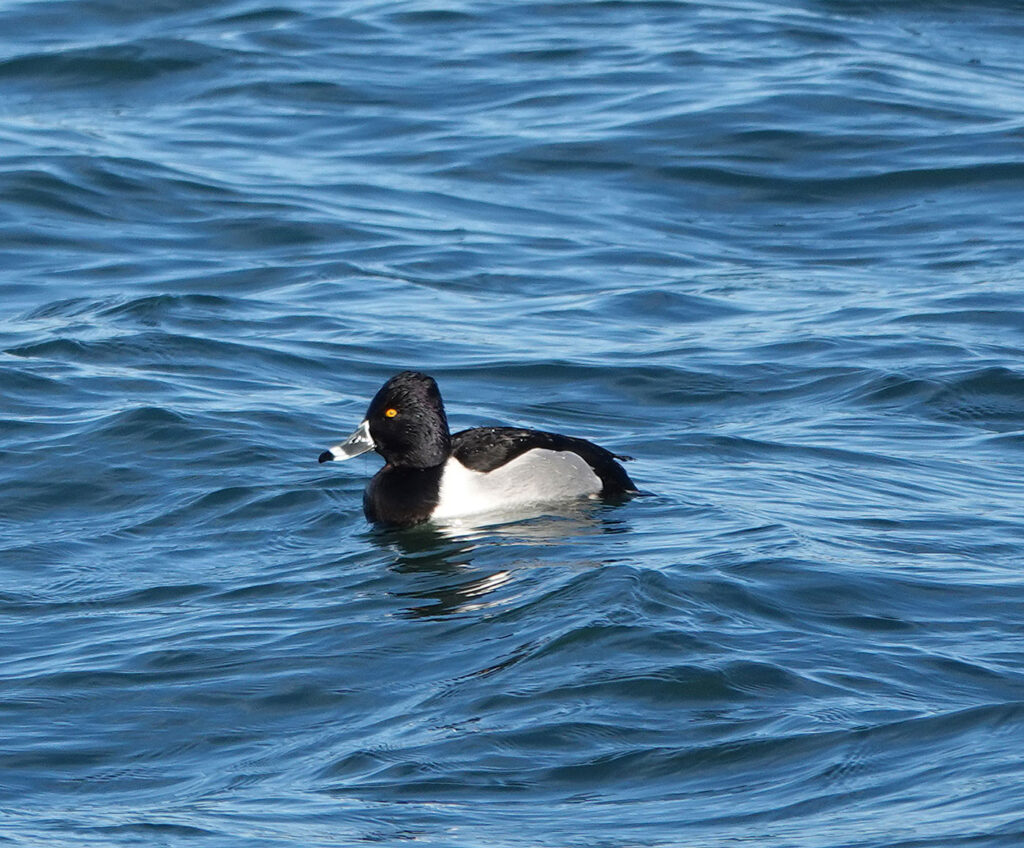 Das Wetter soll gut werden. Mein erstes Ziel heute ist der Moosburger Stausee (Bild). Noch hängen die Wolken tief, aber es dauert nicht lange, und die Sonne kommt hervor. Ich bin auf der Suche nach der Ringschnabelente, die hier am 7. Dezember 2025 das erste Mal gesichtet wurde. Da der Stausee sehr groß ist, stelle ich mich auf eine längere Suche ein. Ich habe jedoch Glück und treffe zwei hiesige Ornithologen, die mir zeigen, wo sich die gesuchte Ente ungefähr aufhält. Es dauert nicht lange, dann finde ich die Ringschnabelente (Bilder) in einem Trupp Reiherenten. Ihr großer Kopf, ihre steile Stirn und das weiße Band hinter ihrer schwarzen Schnabelspitze helfen, das adulte Männchen eindeutig zu identifizieren. »Diese nordamerikanische Tauchente ist in Mitteleuropa ein sehr seltener Irrgast, wobei die Zahl der Beobachtungen seit den 1970er-Jahren zugenommen hat … In Deutschland ist sie zwischen 1977 und 1997 insgesamt 22 Mal beobachtet worden.« (Quelle: Wikipedia) Es ist erst meine zweite Beobachtung dieser Art. Im Februar 2020 hatte ich am Lech schon eine Ringschnabelente gesehen. Bis zum 5. Januar 2026 hielt sich die Ringschnabelente am Moosburger See auf. Danach wechselte sie zum Echinger Stausee, wo sie am 26. Februar 2026 zum letzten Mal gesichtet wurde.
