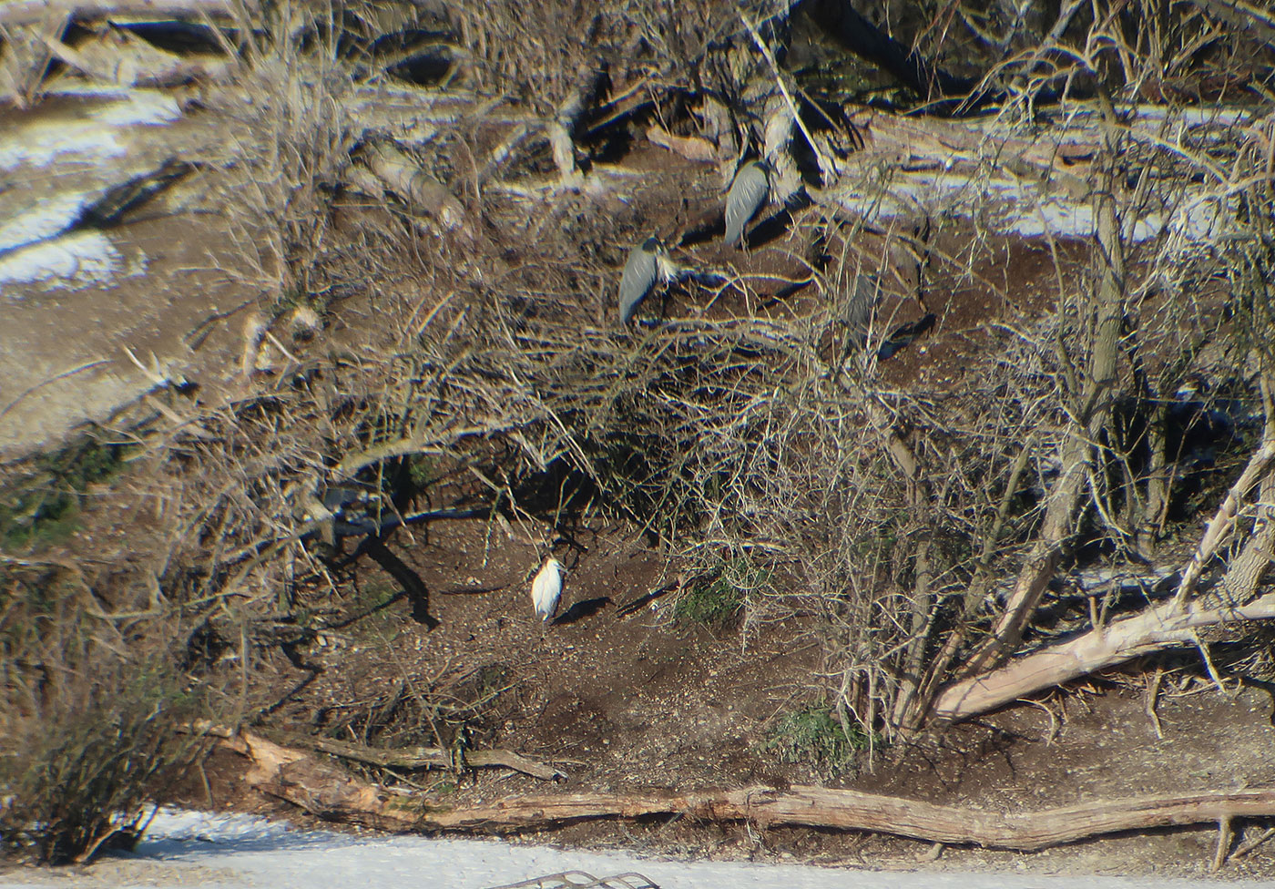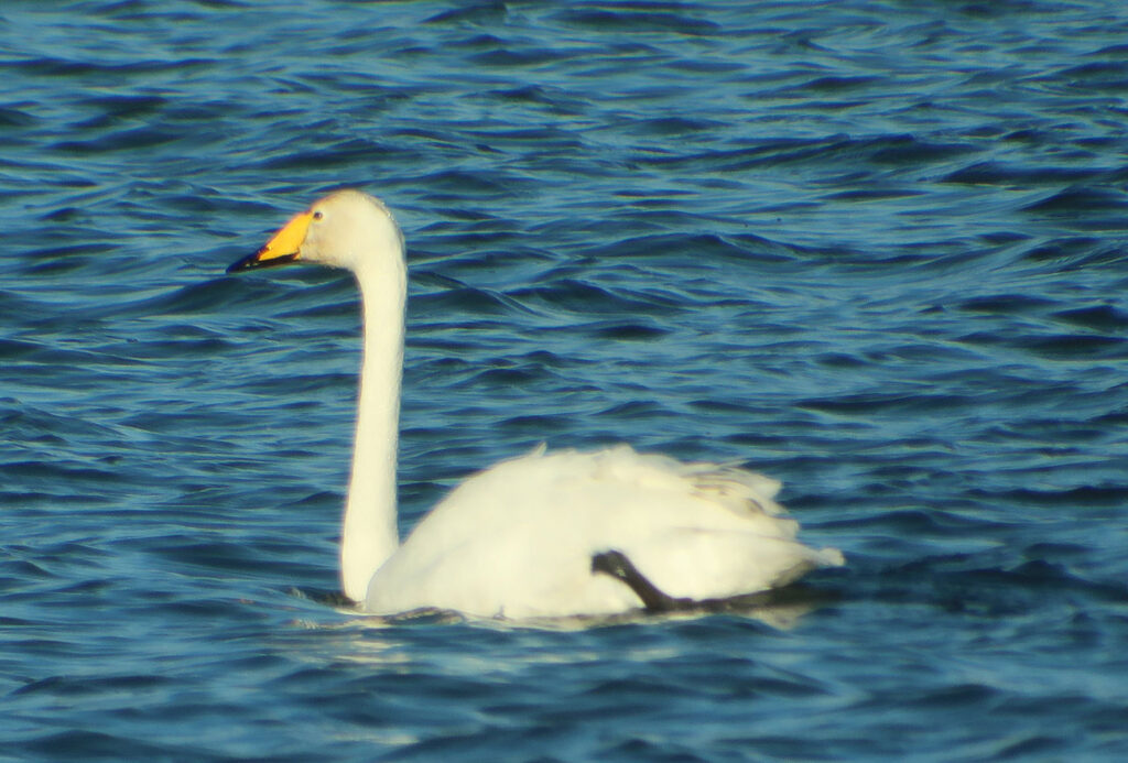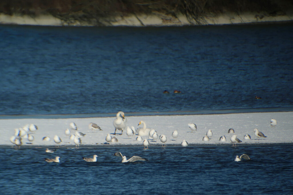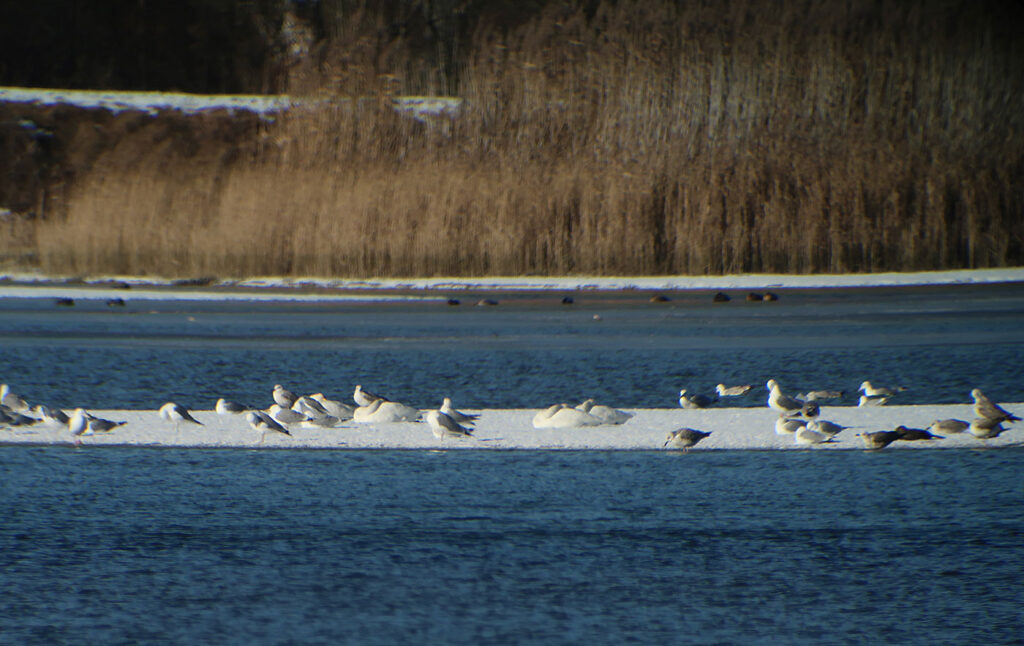 Mein zweites Ziel ist der nur wenige Kilometer in östlicher Richtung entfernte Echinger Stausee (Bild). Teile des Sees sind zugefroren. Ein kleiner Trupp Krickenten (Bild) nutzt die Eisfläche als Ruheplatz. Weiter draußen sehe ich Löffelenten (Bild), die hier anscheinend ihren Winter verbringen. Auf der großen Insel entdecke ich neben den Graureihern auch einen Seidenreiher (Bild). Auch er ist normalerweise um diese Jahreszeit in südlicheren Gefilden anzutreffen. Leider auch sehr weit entfernt, halten sich auf einer Sandbank viele Großmöwen (Bild) und einige schlafende Schwäne auf. Erst als diese den Kopf aus ihrem Gefieder nehmen, erkenne ich die Singschwäne (Bilder) eindeutig. Ihr gelber Schnabel mit schwarzer Spitze ist ein Erkennungsmerkmal. Zur Brutzeit leben sie im Norden Europas, den Winter verbringen sie in Nordwest- und Mitteleuropa. »Je nach Jahreszeit sind Singschwäne sowohl tag- als auch nachtaktiv. Außerhalb der Brutzeit sind sie durchaus gesellig und vertragen sich mit Artgenossen.« (Quelle: Wikipedia)