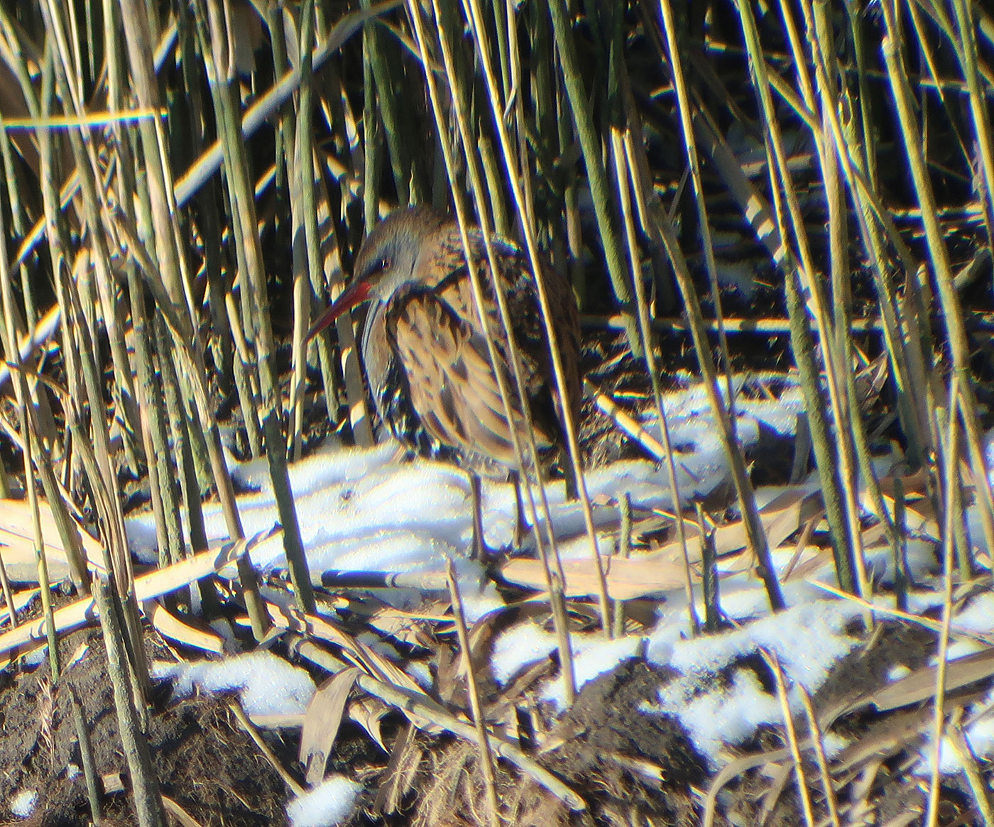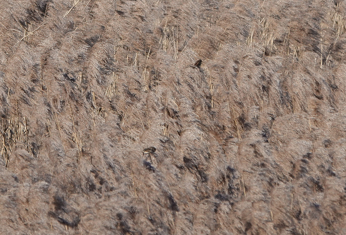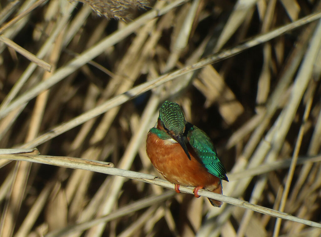 Nach dieser schönen Sichtung – Singschwäne sehe ich auch nicht so oft – widme ich mich der näheren Umgebung. Vom Turm aus hat man einen guten Blick auf das Schilfgebiet. Am Schilfrand finde ich eine gut getarnte Wasserralle (Bild). Über eine halbe Stunde lang verharrt sie ruhig am Ufer, dann macht sie sich auf und läuft, während sie nach Futter sucht, an der Wasserkante davon. Sie ernährt sich von kleinen Fischen, Krebstieren, Insekten und deren Larven. Während ich ihr noch nachschaue, blitzt im Schilf etwas Buntes auf. Ein Eisvogel (Bild) kommt angeflogen und landet auf einem Schilfhalm. Auch er hat Hunger, beobachtet intensiv die Wasserfläche und hofft wohl ebenfalls, einen kleinen Fisch zu fangen. Beim Absuchen der weiten Schilfflächen sehe ich noch einige kleinere Vögel hin- und herfliegen. Es sind Rohrammern (Bild), die an den Rispen nach Körnern suchen.