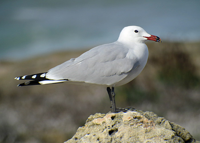 Der schöne Weg schlängelt sich durch eine offene mediterrane Heidelandschaft (Garigue) (Bild). Einmal komme ich einem Wiedehopf zu nahe und er fliegt auf. Etwas oberhalb vom Strand steht eine Beobachtungsplattform zur Verfügung. Von hier hat man einen tollen Blick zum Meer (Bild). In den dichten Büschen rund um die Plattform sind Schwarzkehlchen (eines davon im Bild) und Samtkopf-Grasmücken auf Beerensuche. Beim Weg, der unten am Strand entlang führt, sehe ich einen Waldwasserläufer (Bild). Oder könnte es auch ein Flussuferläufer sein? Ich bin mir nicht ganz sicher. Ich will ihn suchen und gehe zum Strand, aber da ist er schon verschwunden. Mehrere Seeregenpfeifer und einige Korallenmöwen rasten auf den Felsen. Ein Seidenreiher sucht in der kleinen Bucht nach Nahrung. Nach einer kurzen Brotzeitpause werfe ich meinen Apfelbutzen weg. Ärgere mich, dass ich nicht weit genug geworfen habe. Aber da hat auch schon eine Korallenmöwe den Apfelrest entdeckt und frisst ihn auf. Ich bemerke, dass sie sich auf einen Felsen in meiner Nähe niederlässt und mich die ganze Zeit beobachtet. Auf diese Weise kann ich die Korallenmöwe (Bilder) studieren und Fotos machen. Ihr dunkelroter Schnabel, die dunkelgrauen bzw. grünlichen Beine und die dunkle Iris sind gute Erkennungszeichen. Sie ist etwas kleiner als die Mittelmeermöwe. Ihr Hauptverbreitungsgebiet sind die Mittelmeerküsten und die nordatlantischen Küsten Portugals und Frankreichs.
